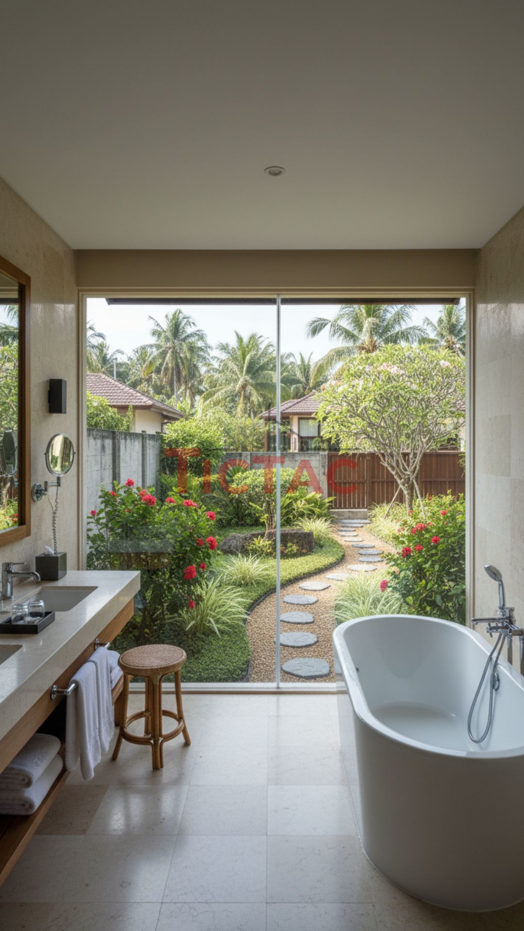 Từ phòng khách, phòng ngủ đến phòng tắm, mọi không gian đều hướng ra vườn – nơi hoa giấy, dâm bụt, thiên điểu cùng khoe sắc.